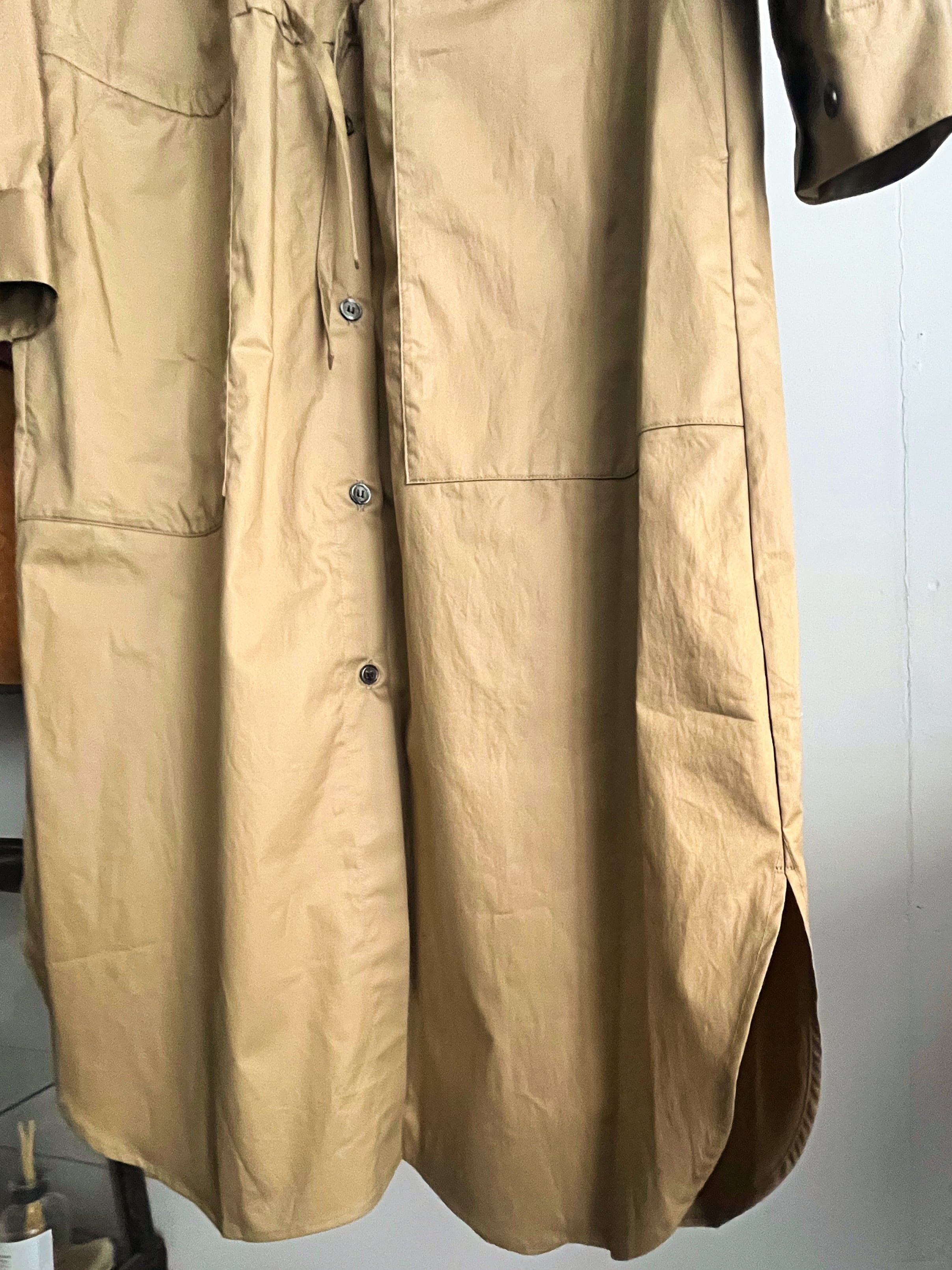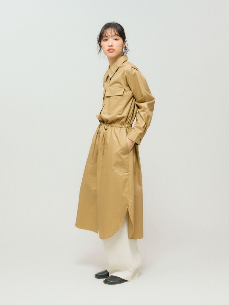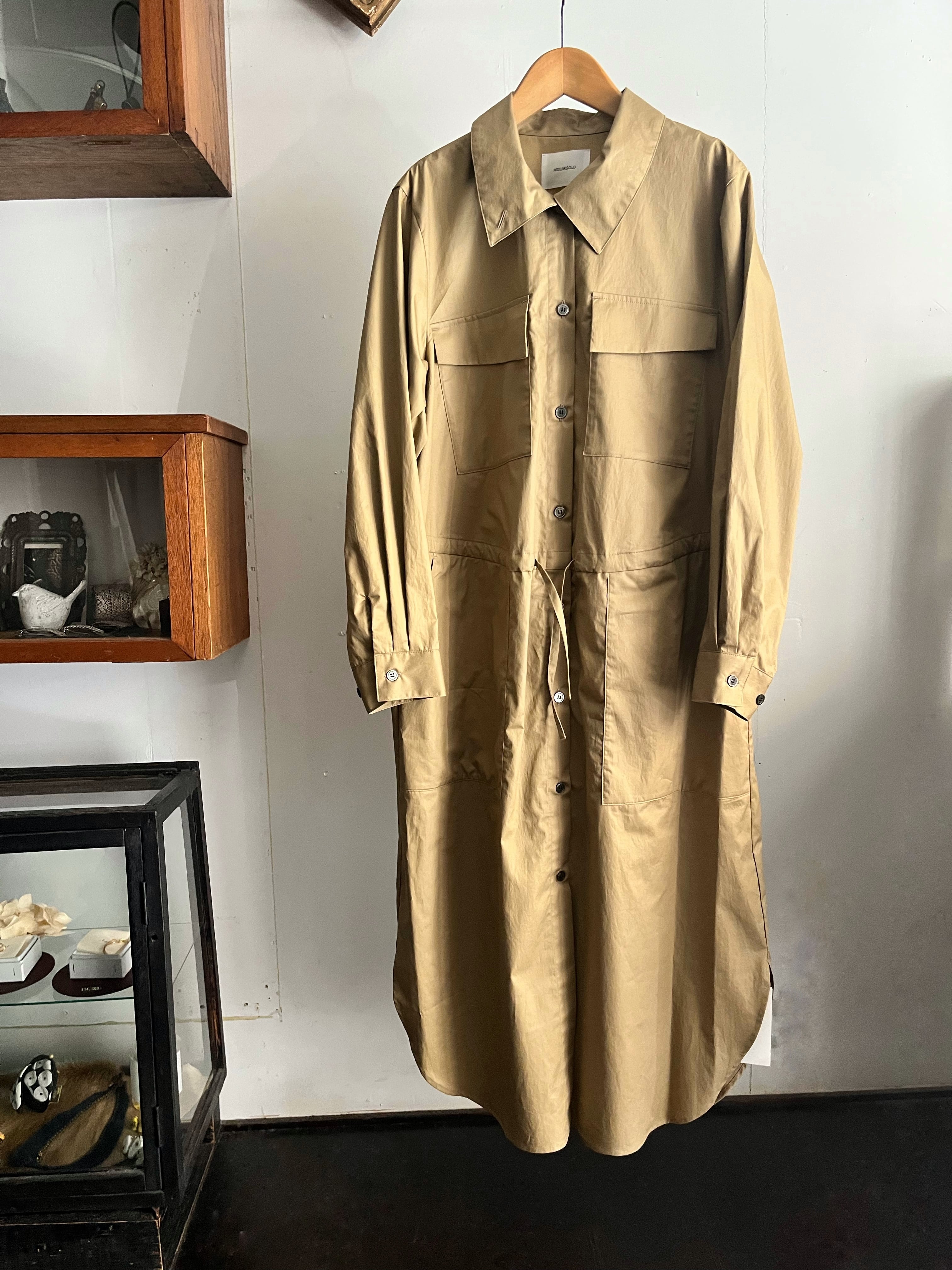高密度の生地に耐久光沢加工とワッシャー加工を施し、毛羽を極限まで削ぎ落すことで独特な光沢を放つ40ツイル素材を使用したワークシャツワンピースです。