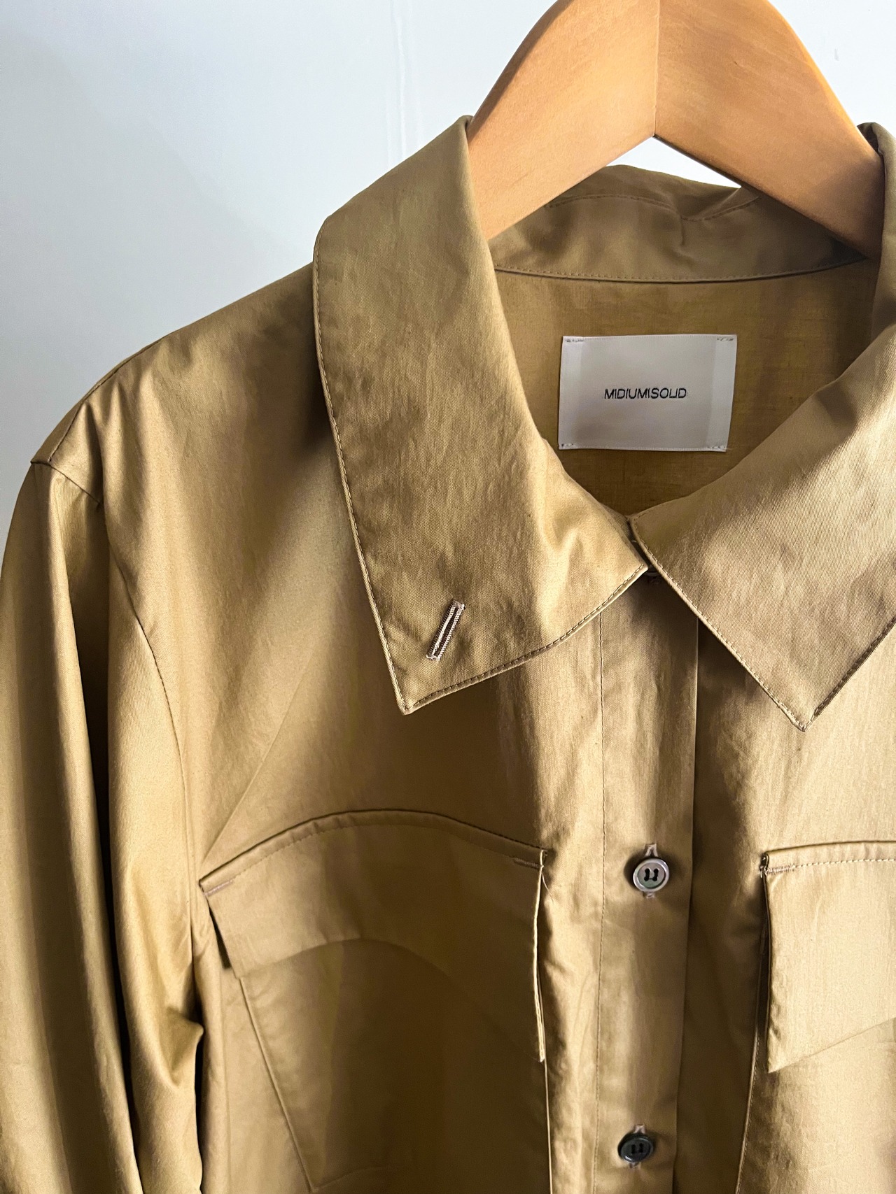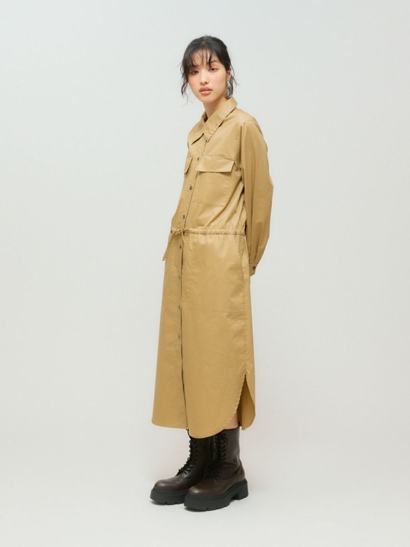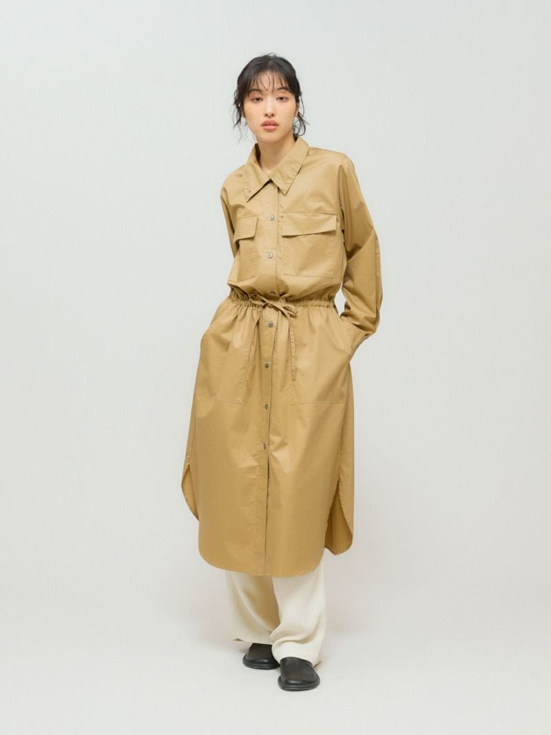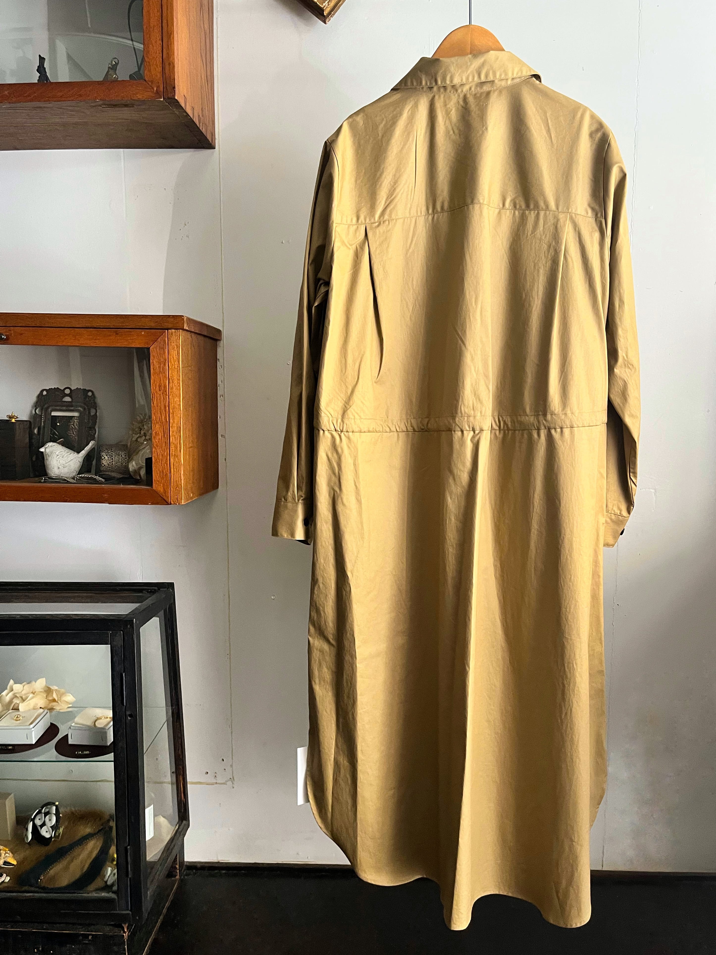 高密度の生地に耐久光沢加工とワッシャー加工を施し、毛羽を極限まで削ぎ落すことで独特な光沢を放つ40ツイル素材を使用したワークシャツワンピースです。