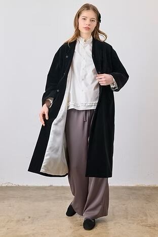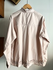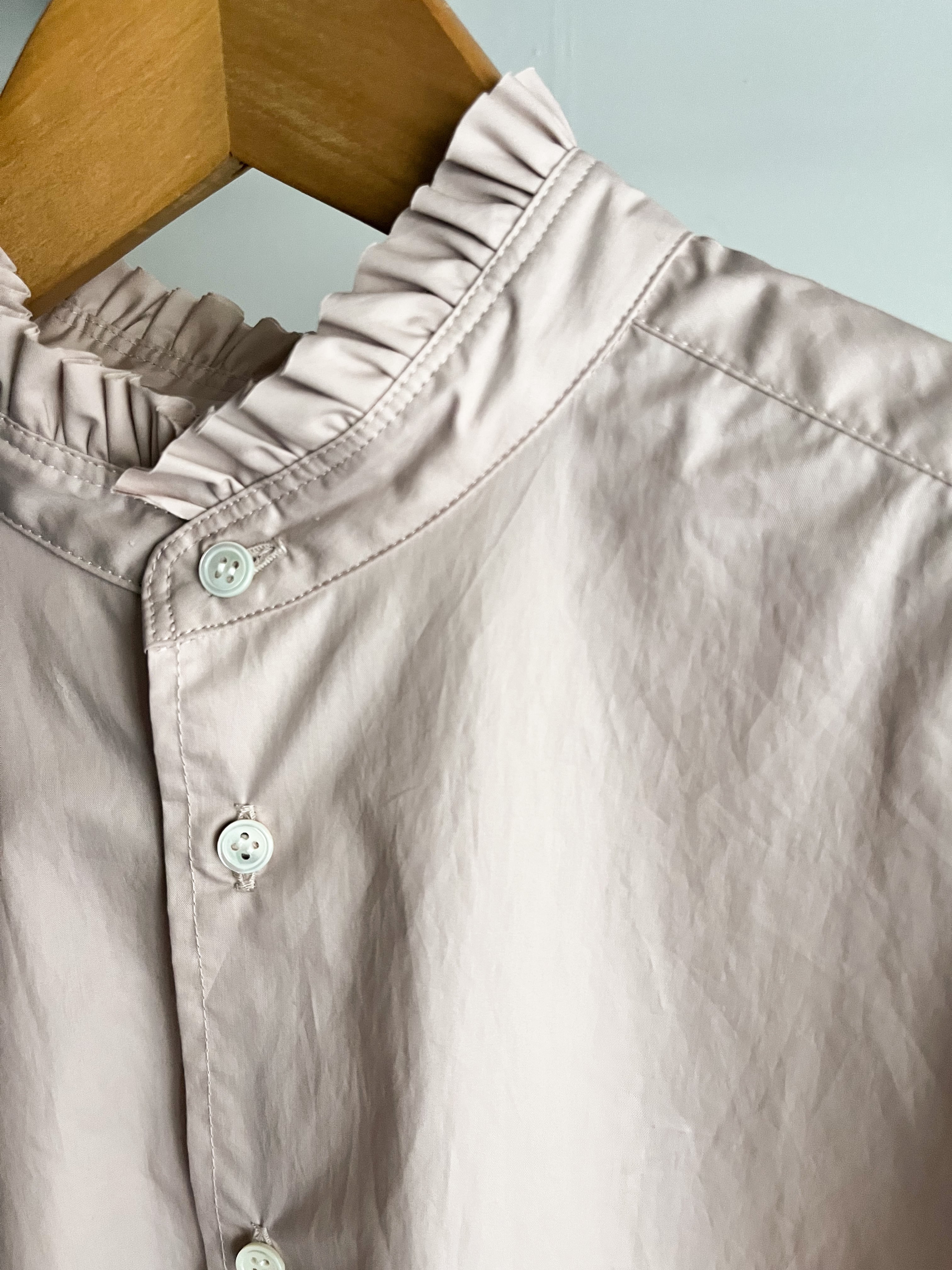 スタンドカラー、袖口、裾部分のフリルが二重になっているのがポイントです。