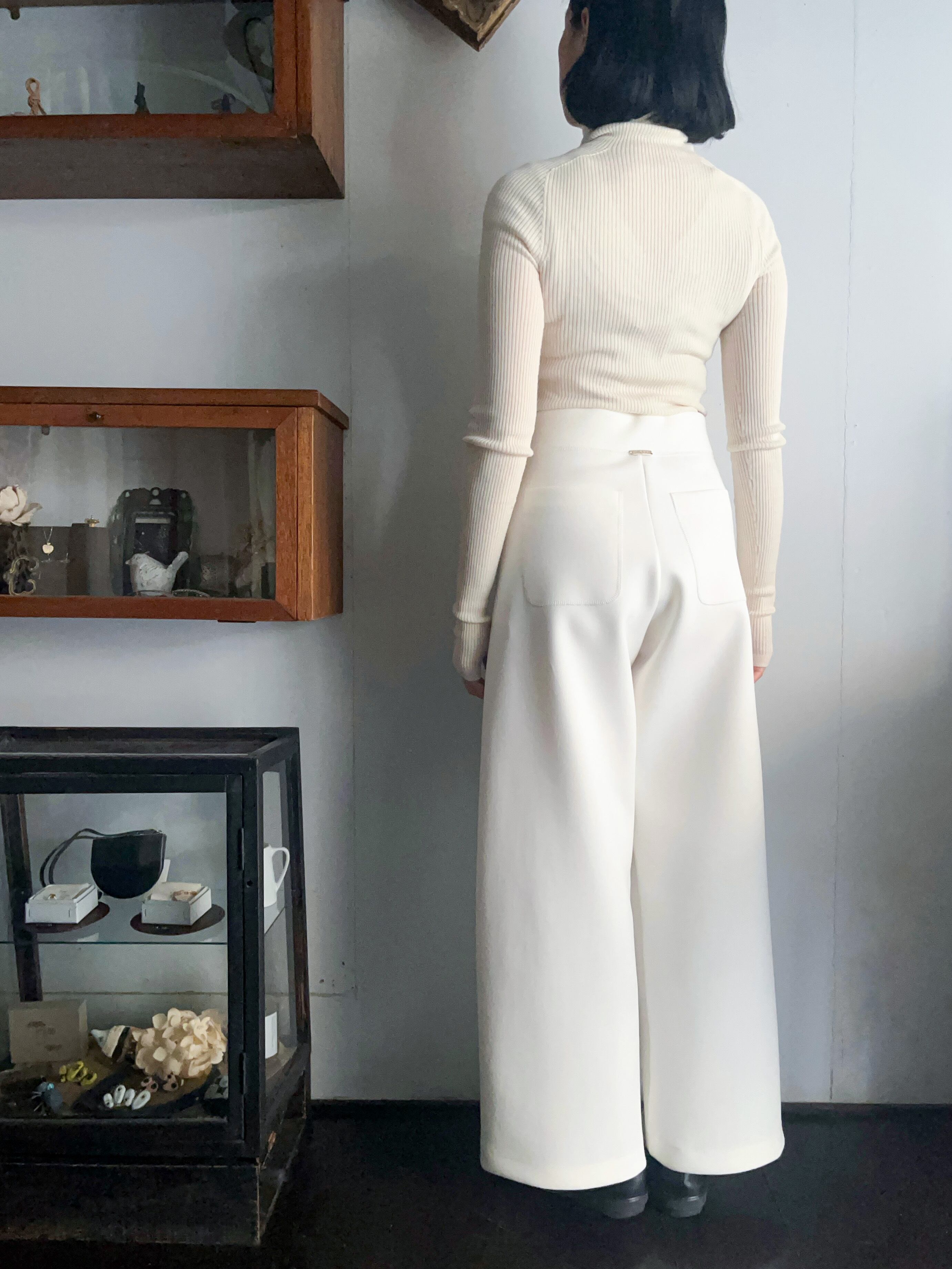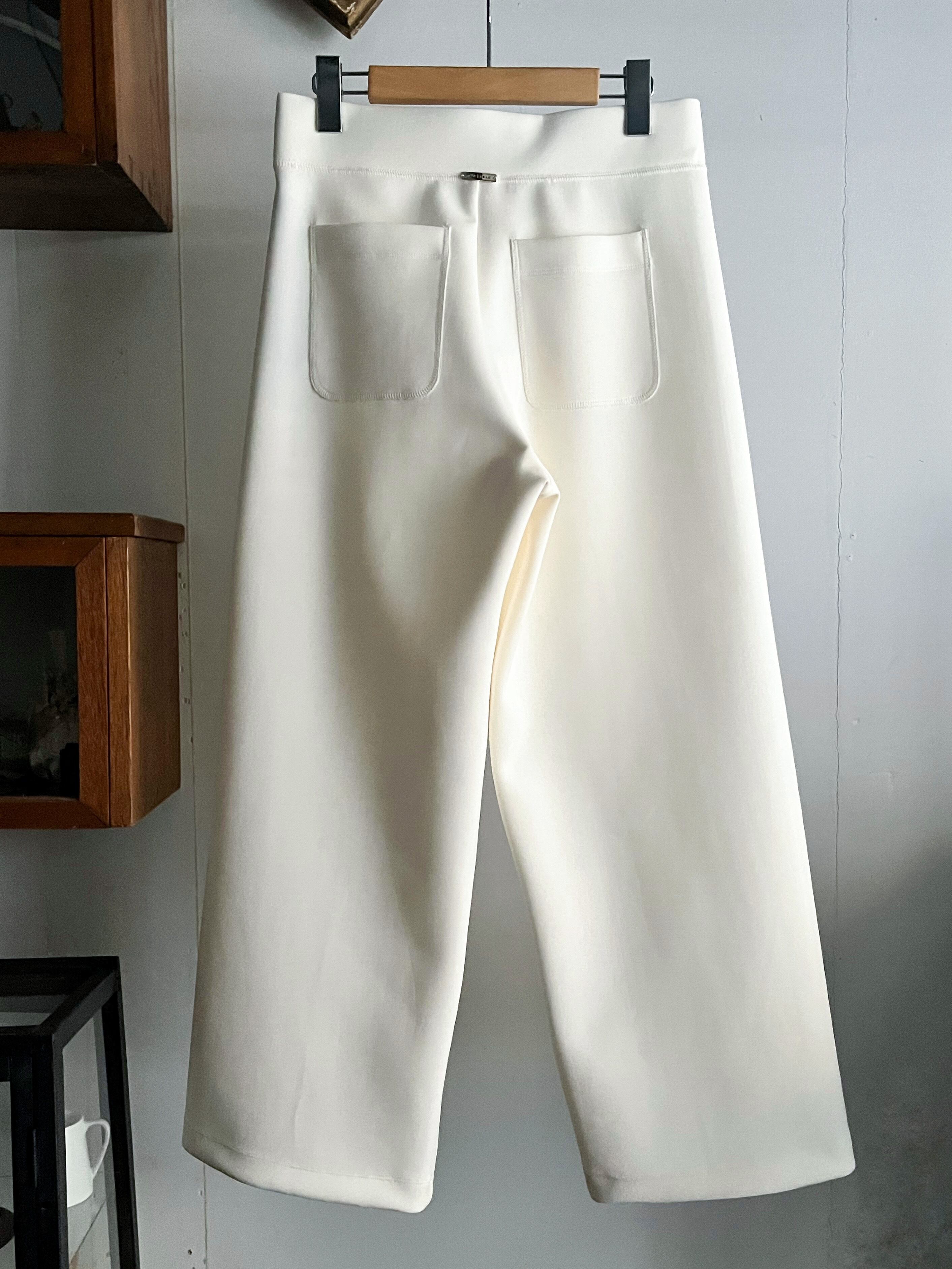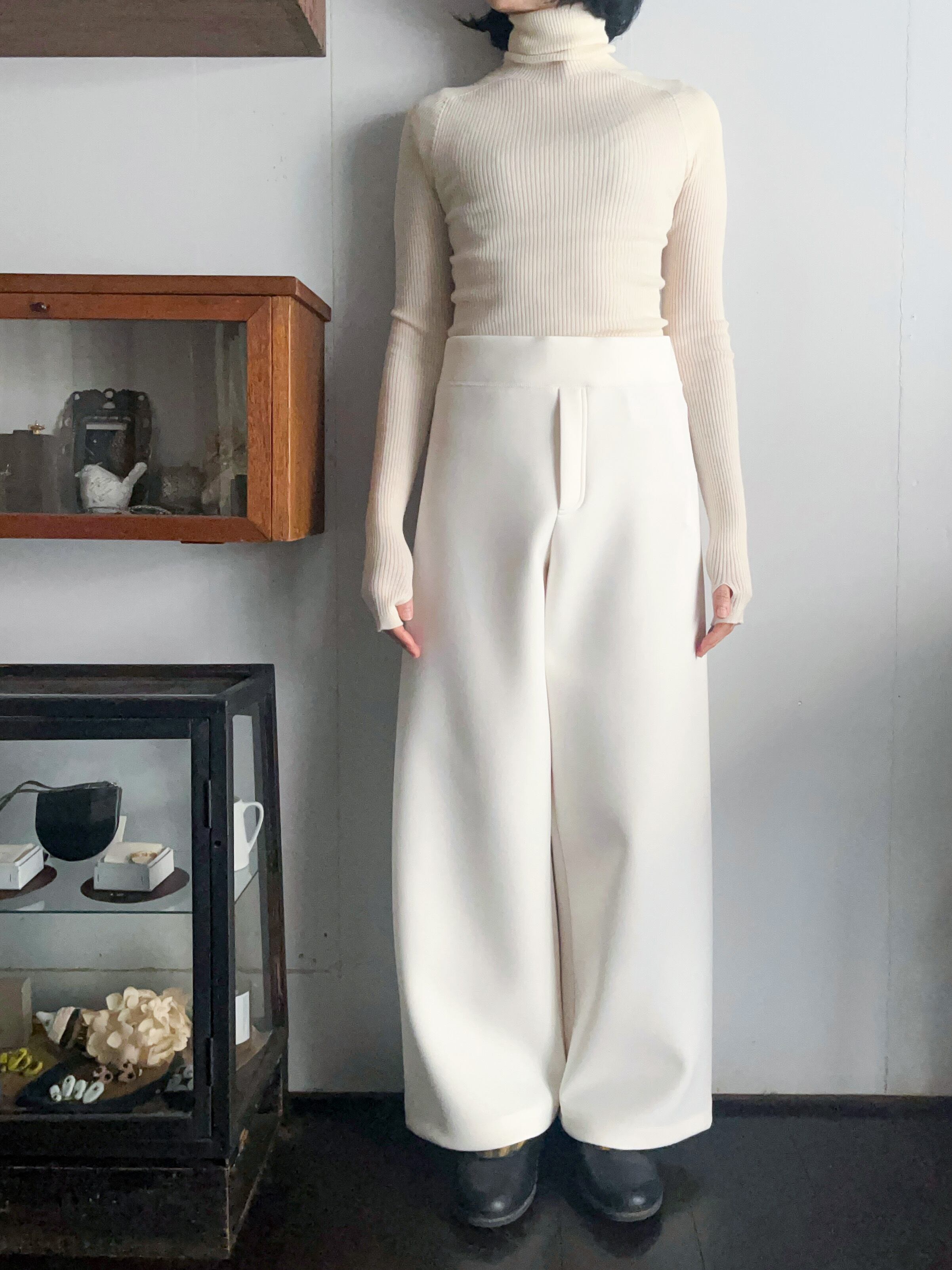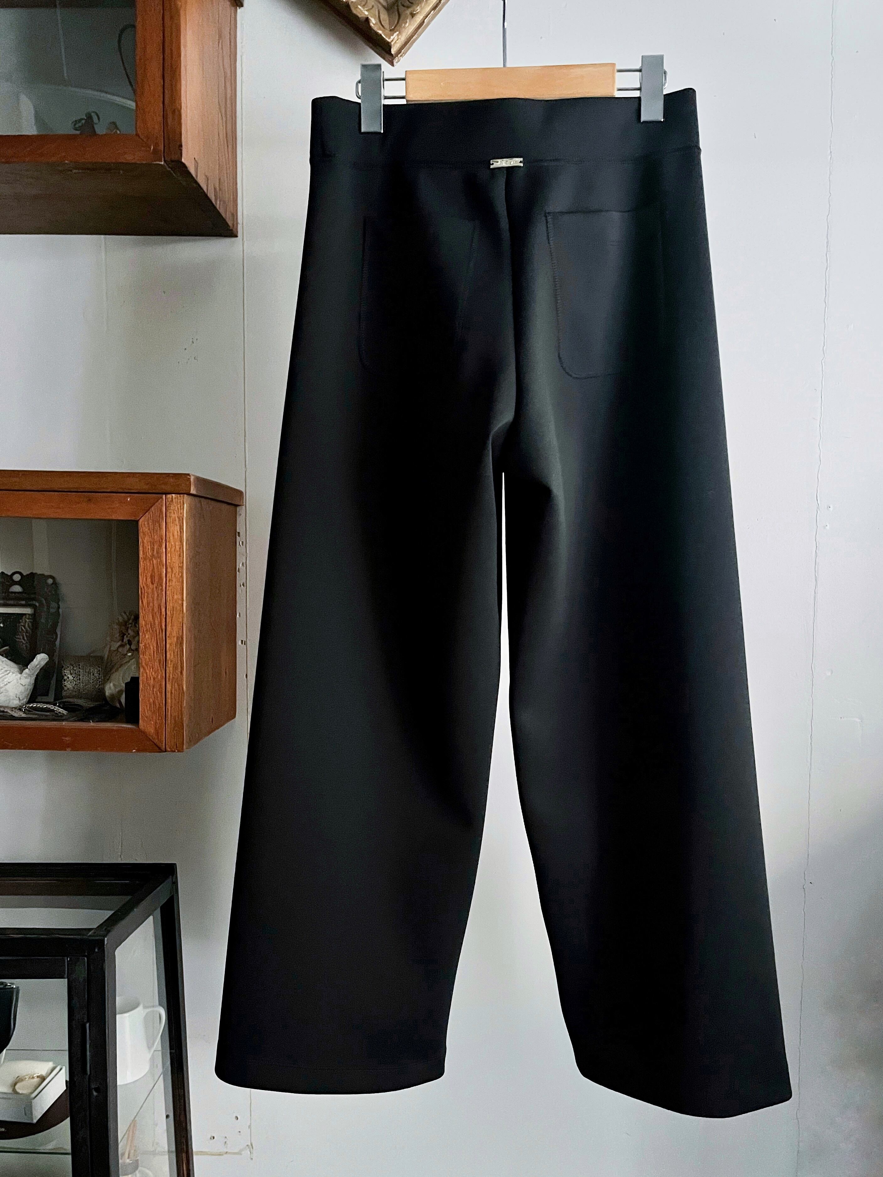 一枚で洗練されたモード感が完成するスキューバニットのワイドパンツ。