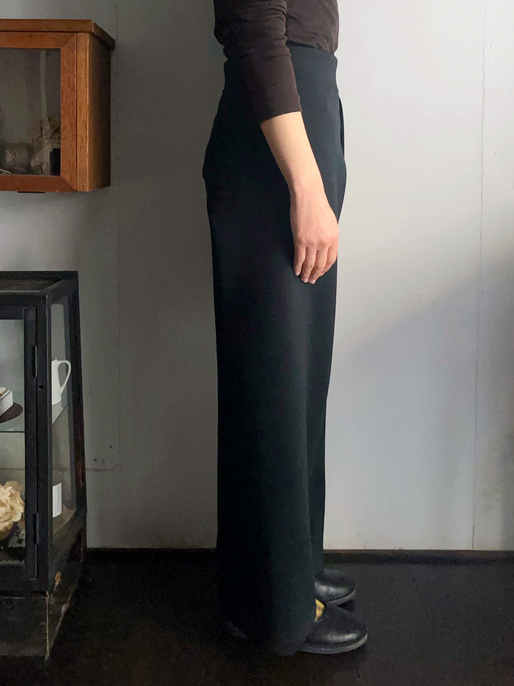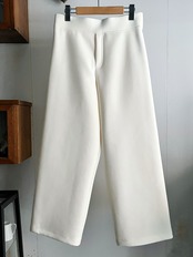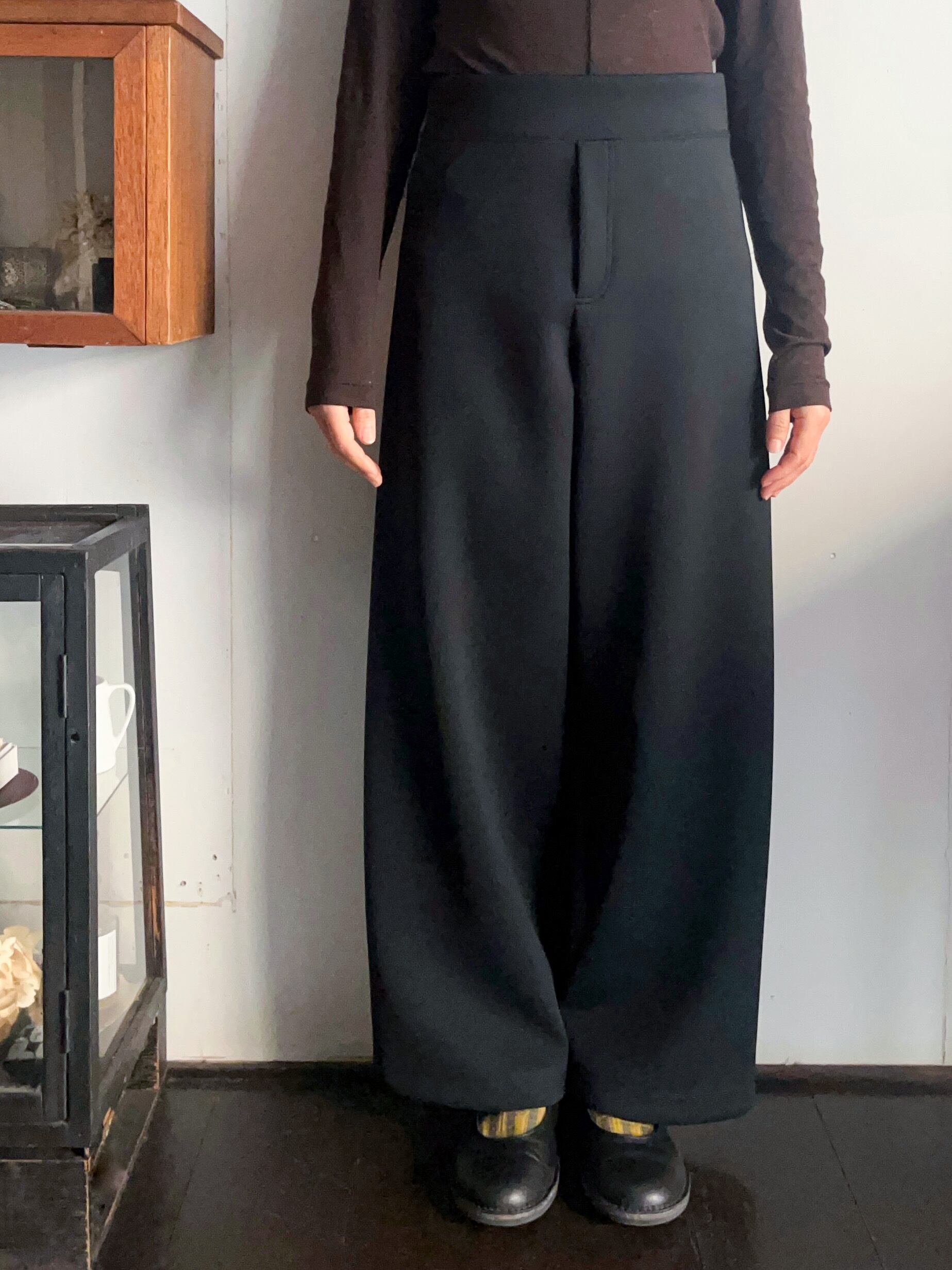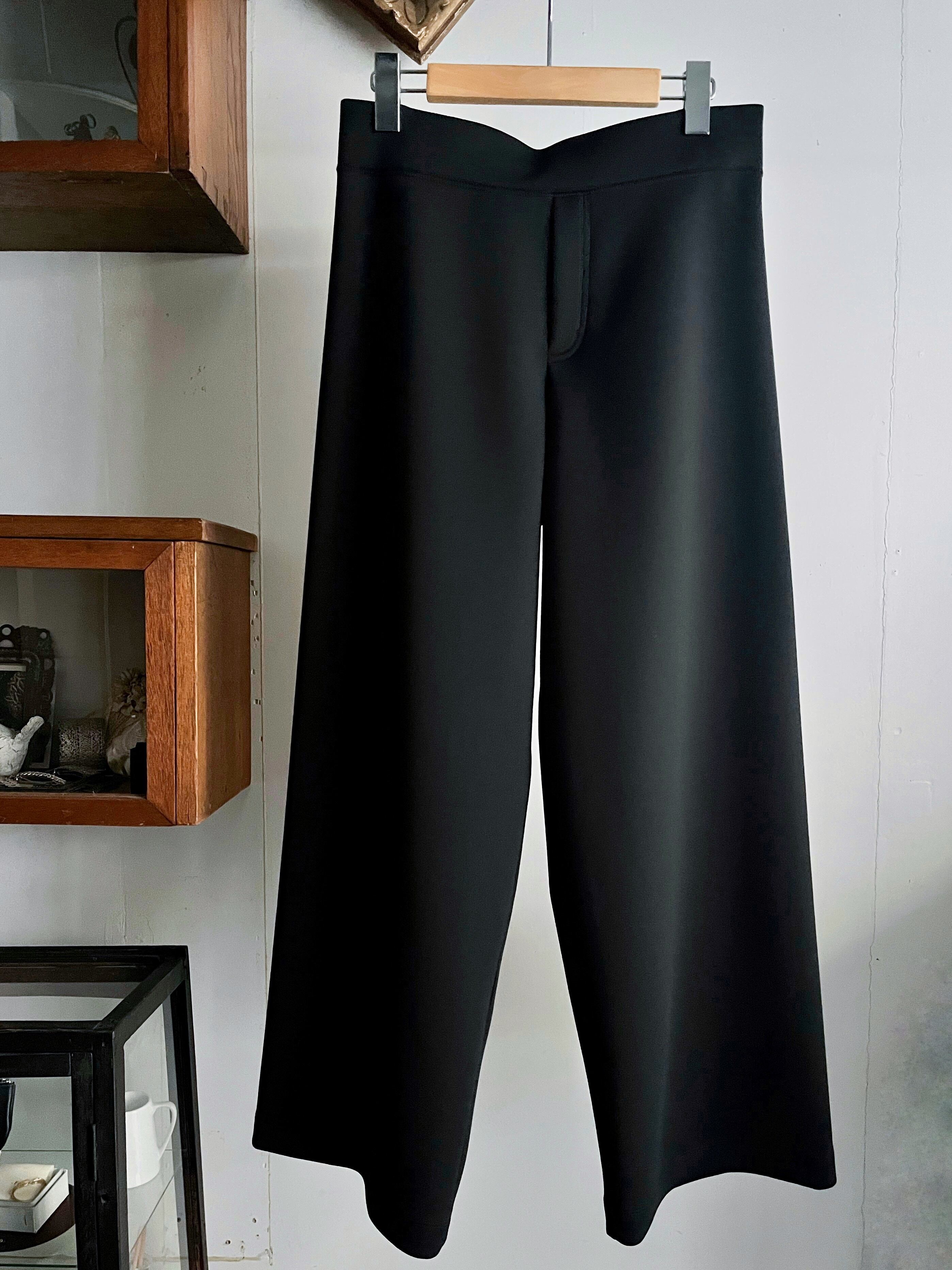 一枚で洗練されたモード感が完成するスキューバニットのワイドパンツ。