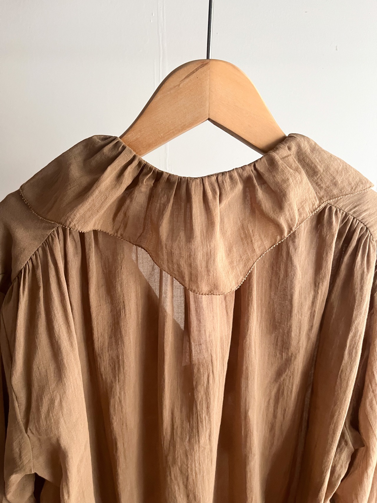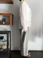 深めのVネックと、肩、袖口のギャザーによるふわりとしたシルエットは、