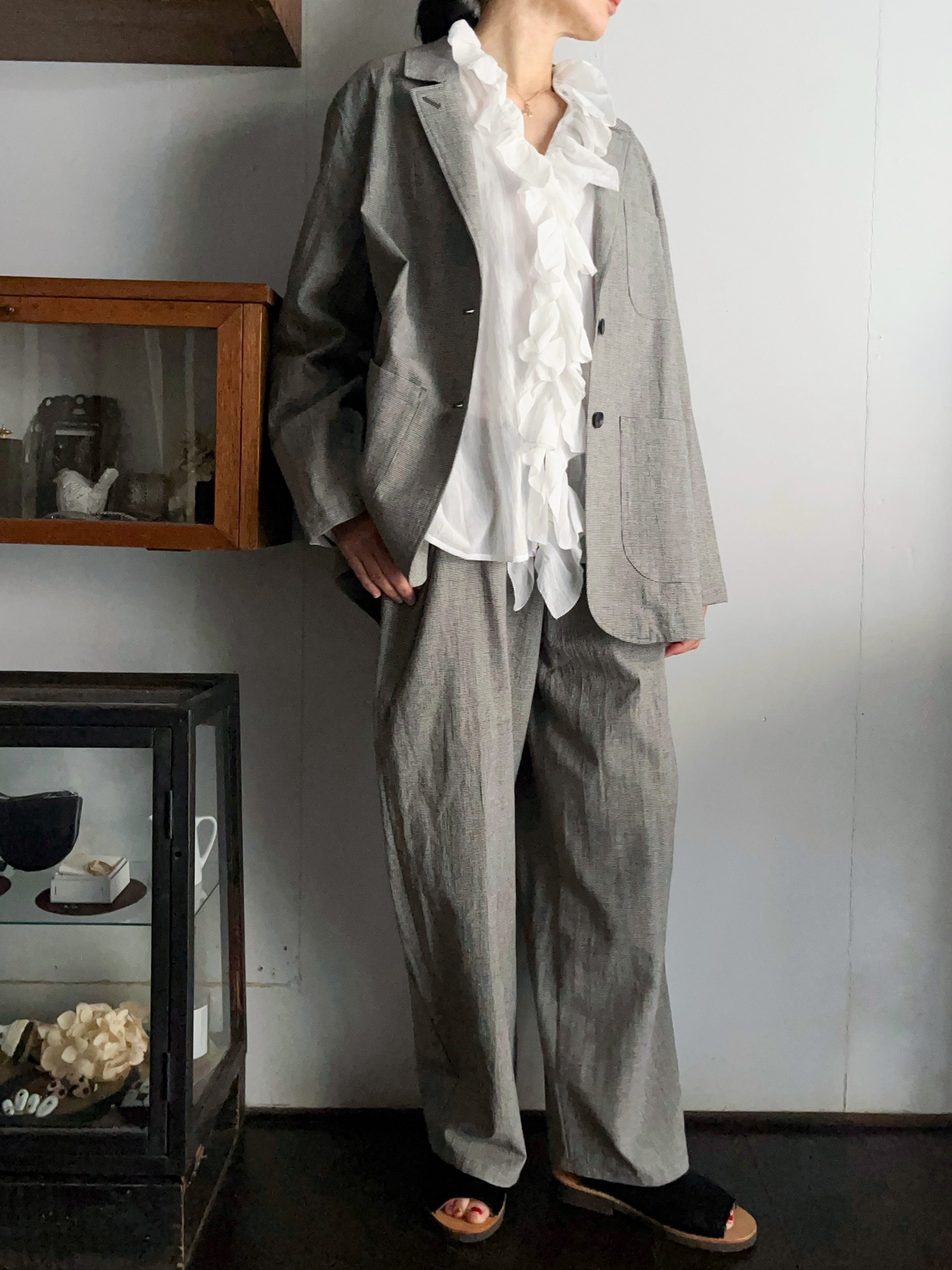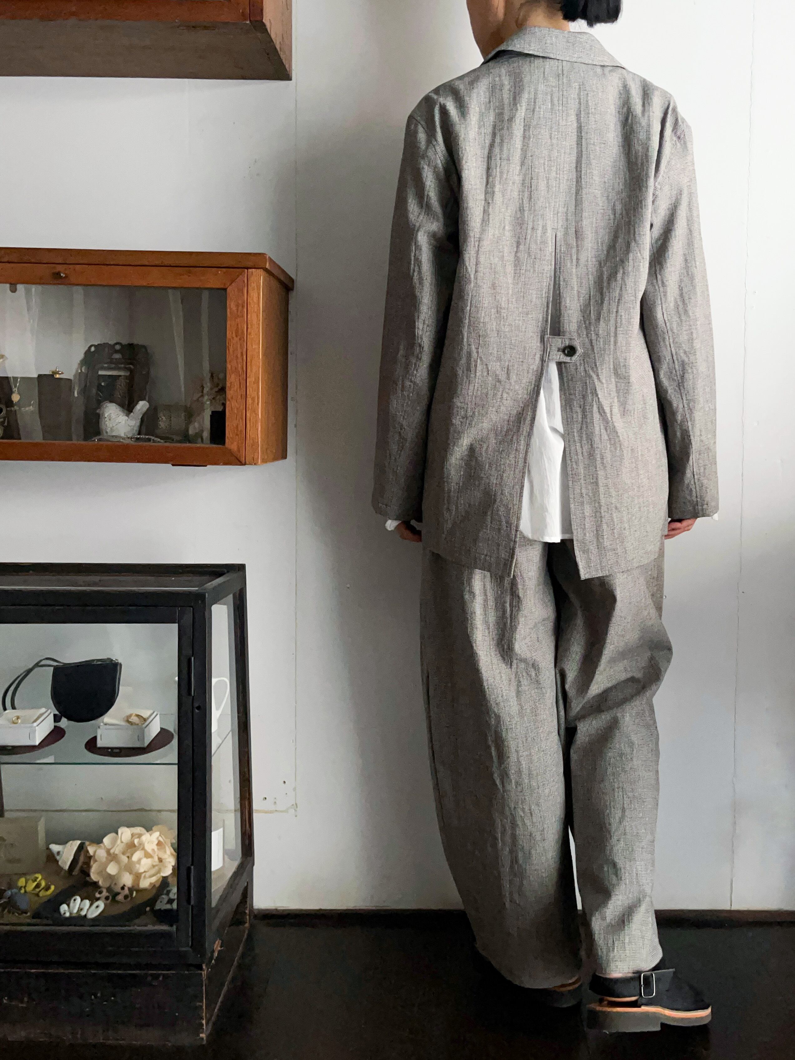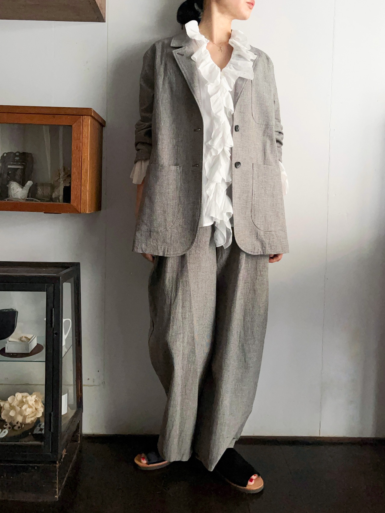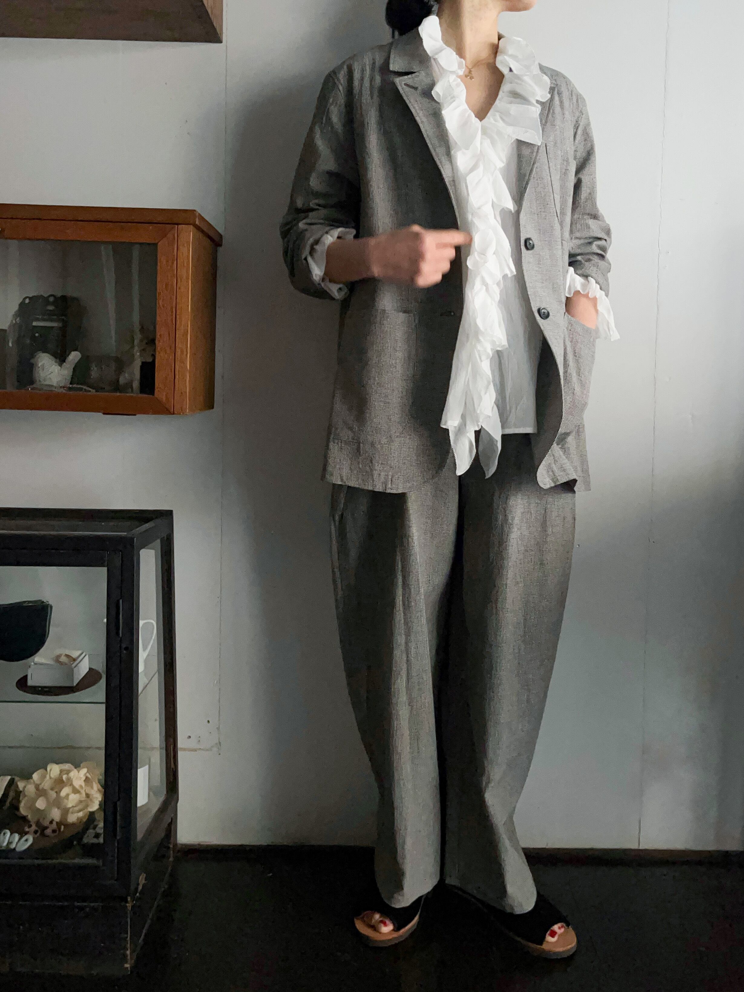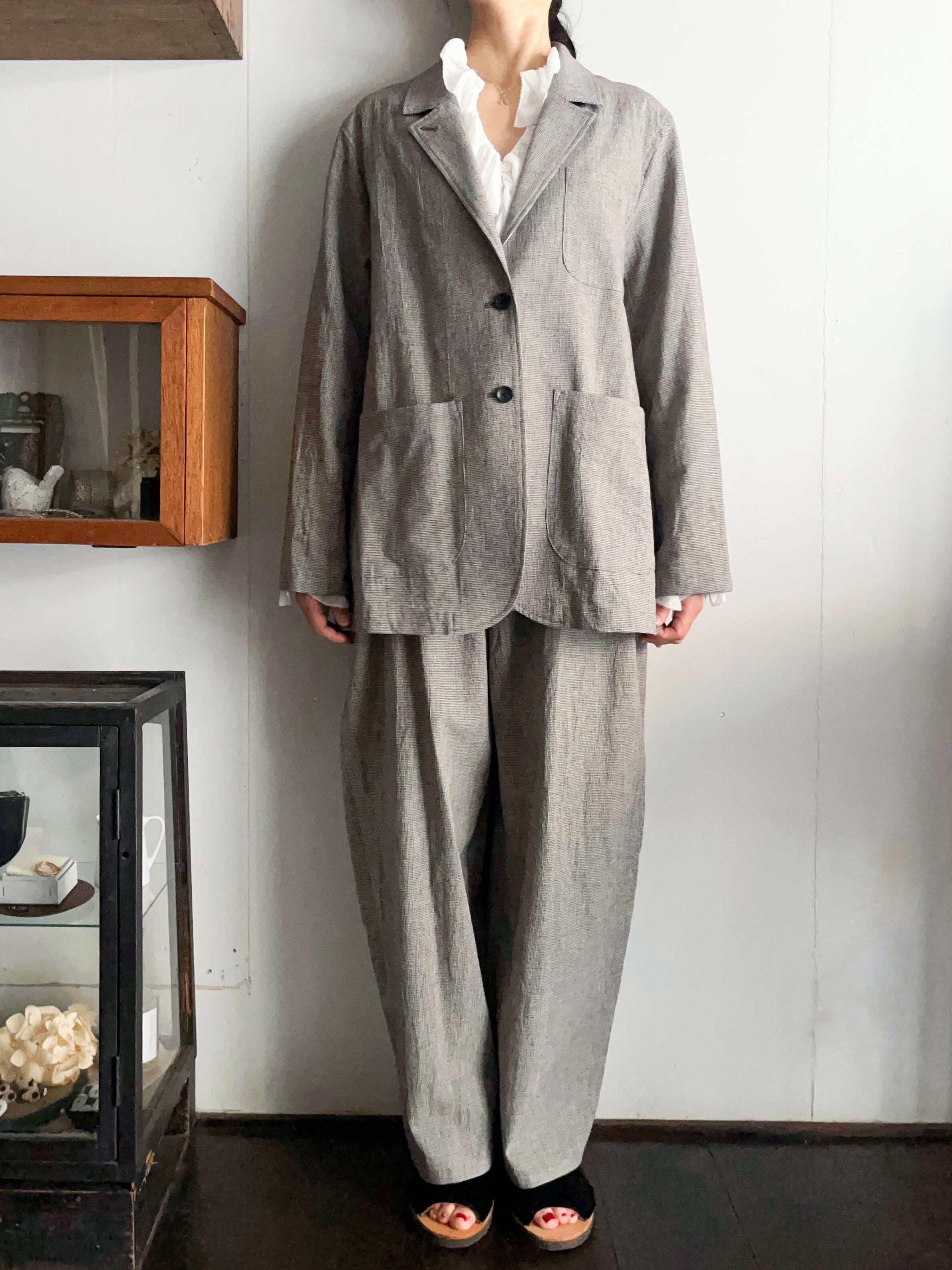 同布のパンツとセットアップコーディネートもおすすめです。