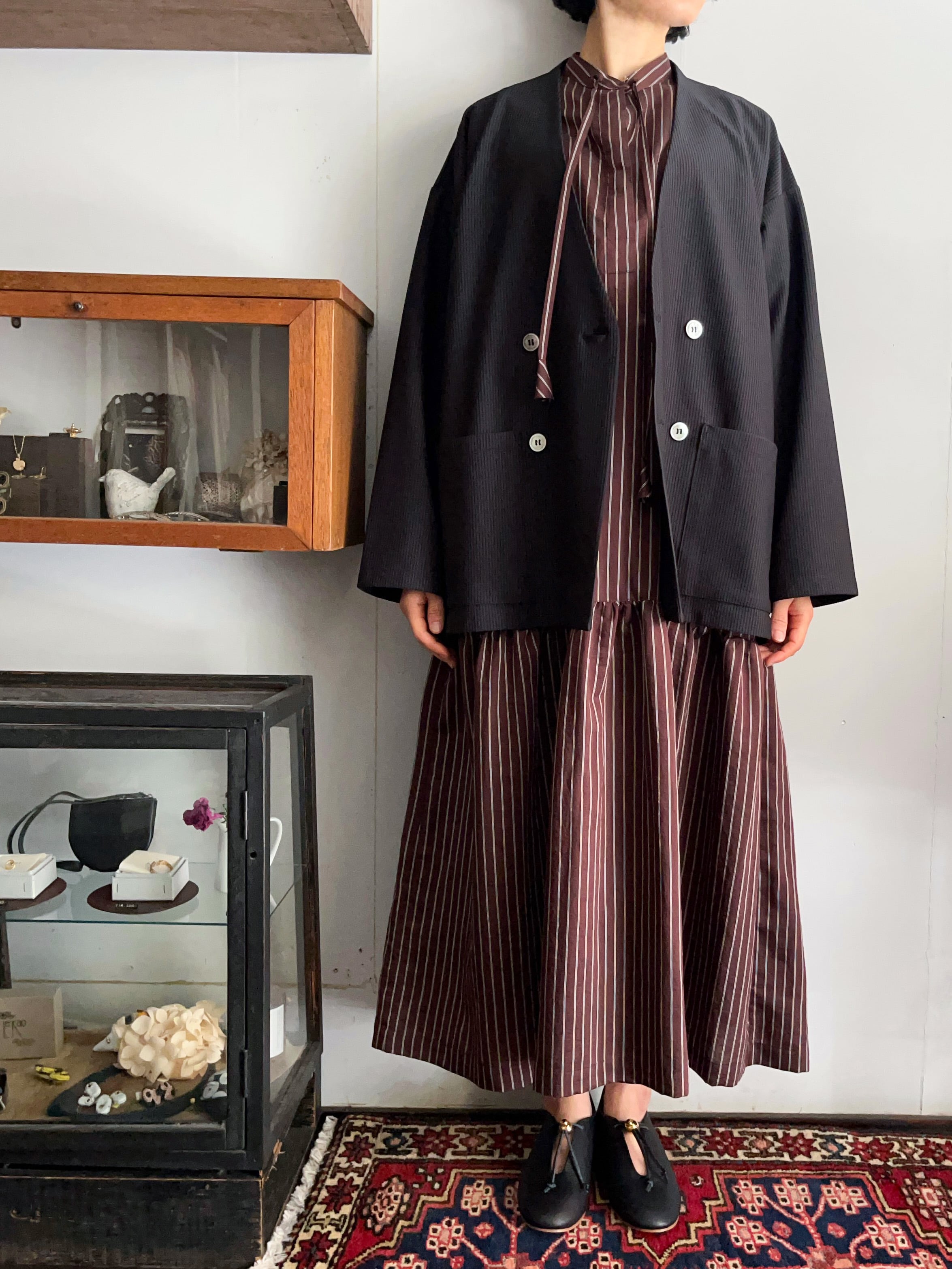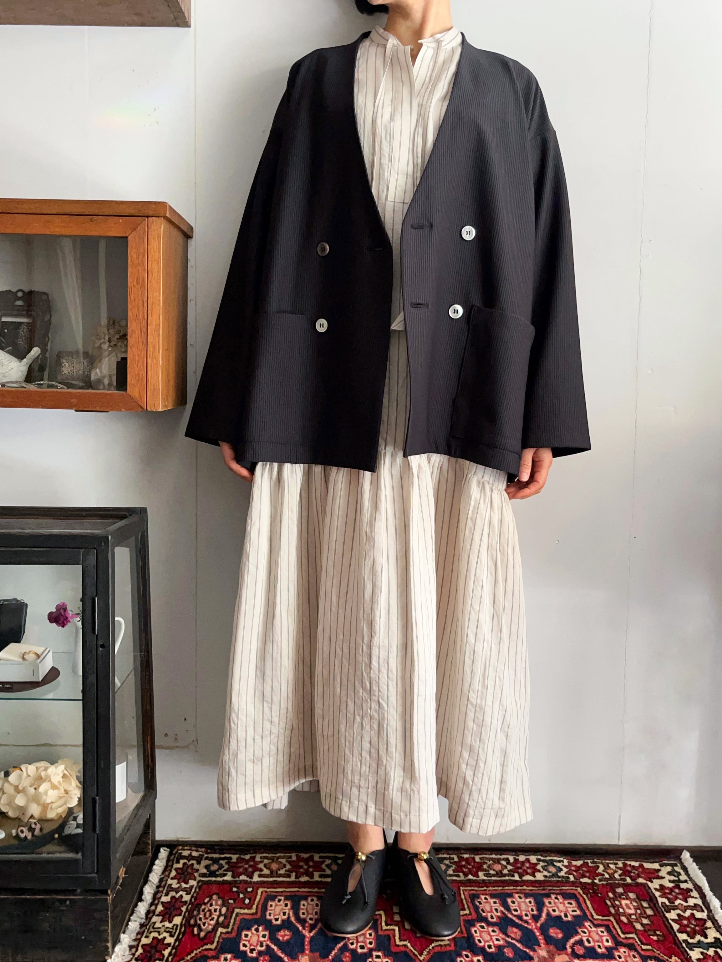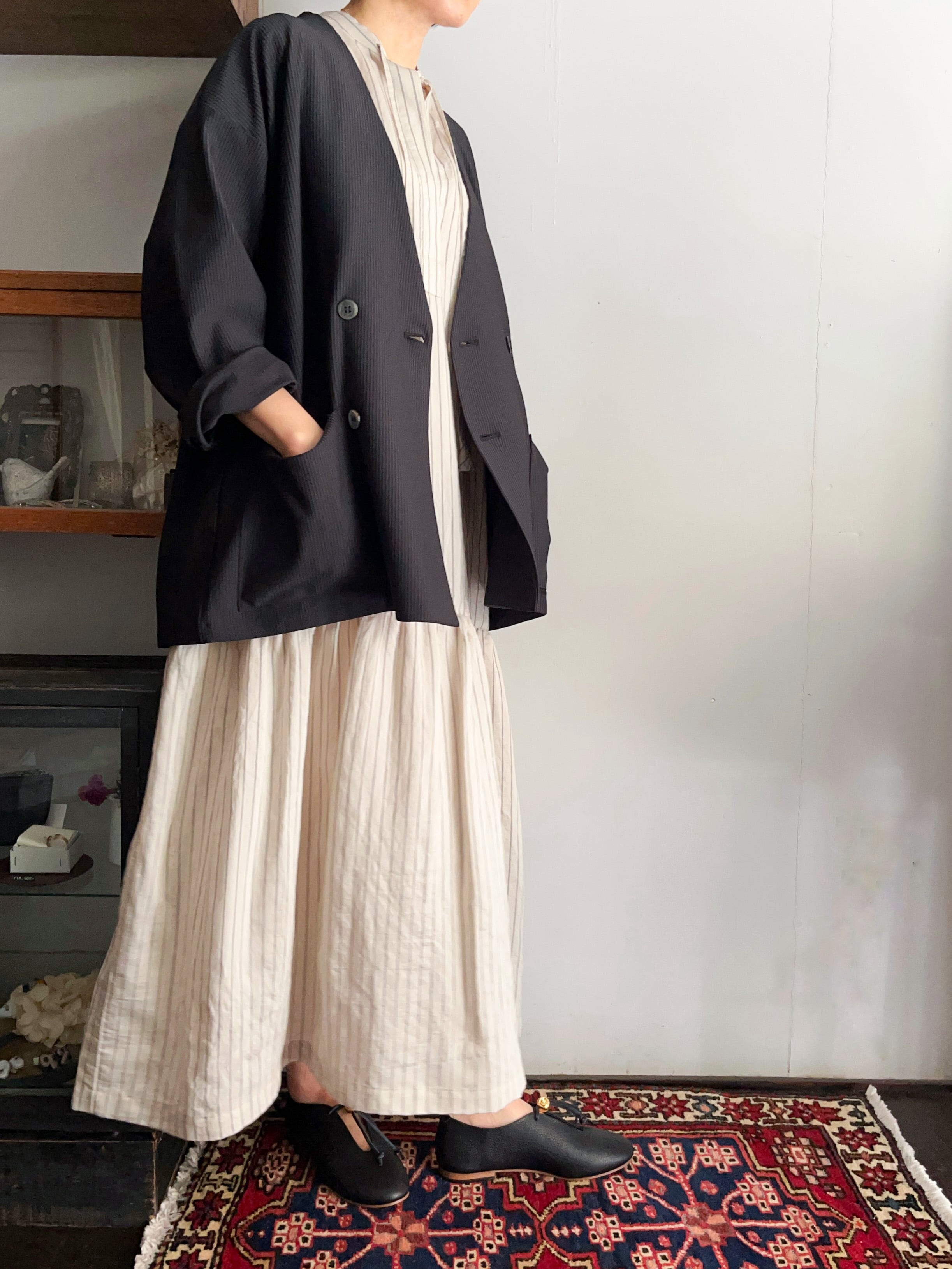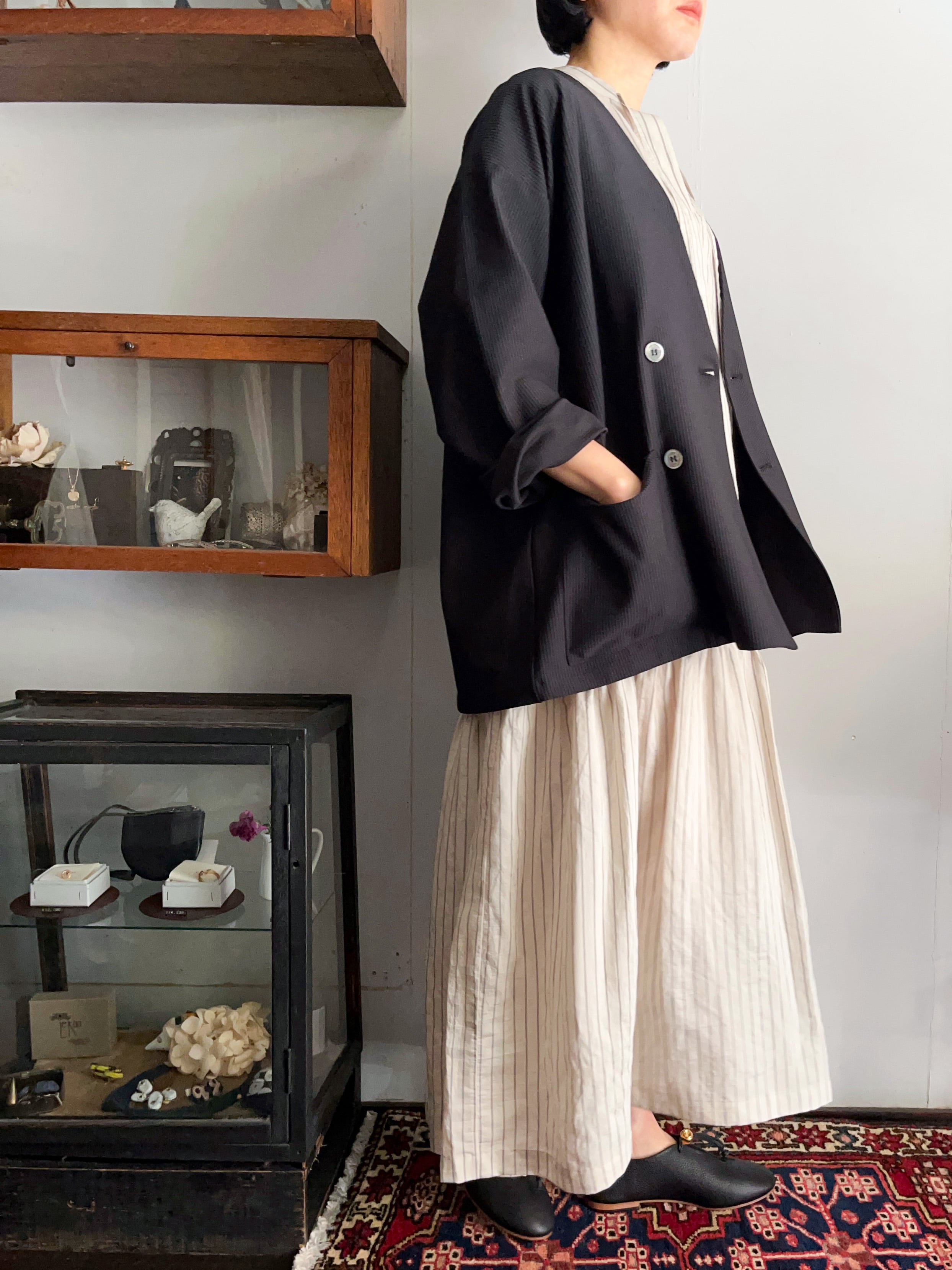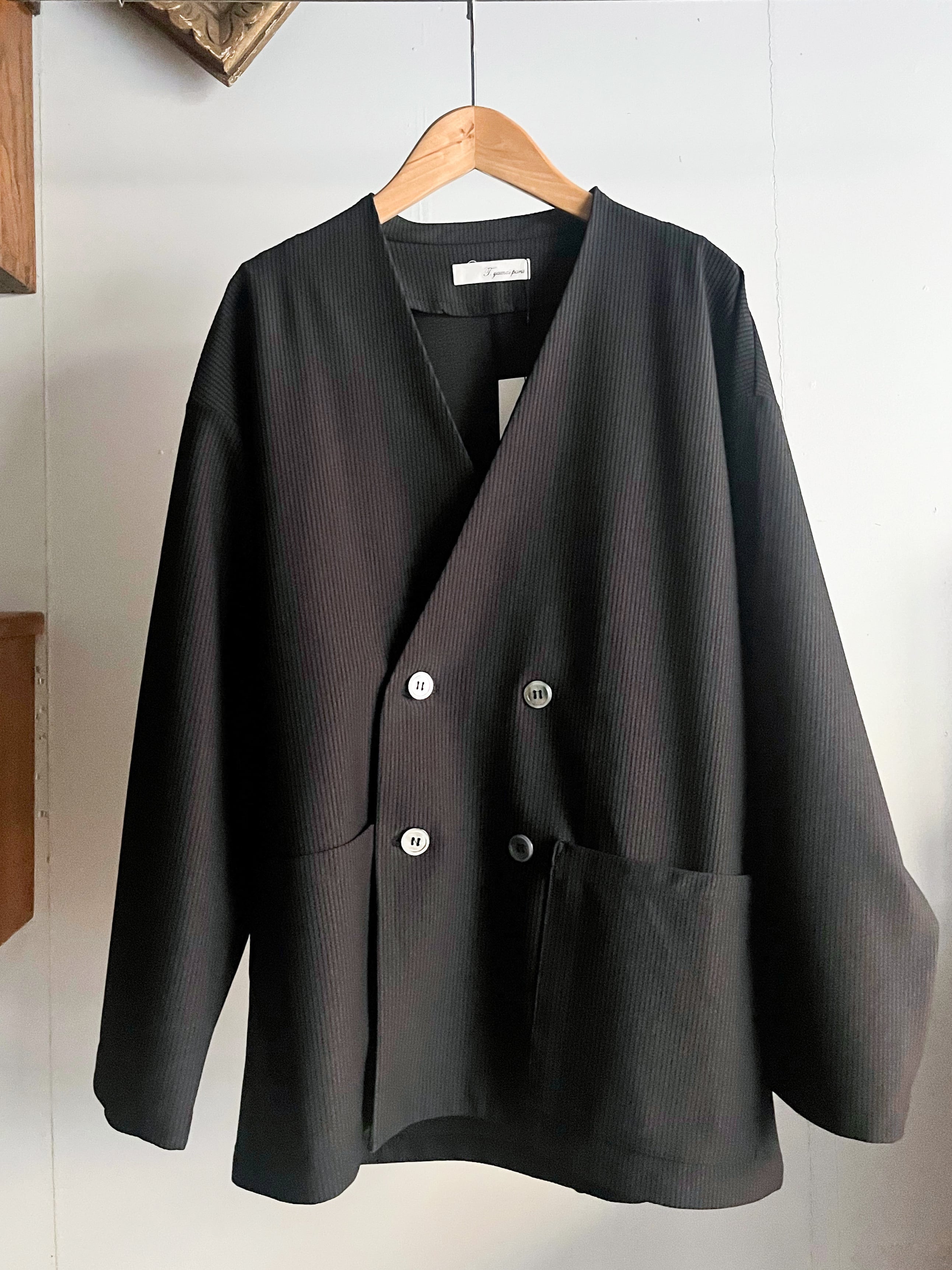 トリコットのサッカー素材を使ったノーカラージャケットです。