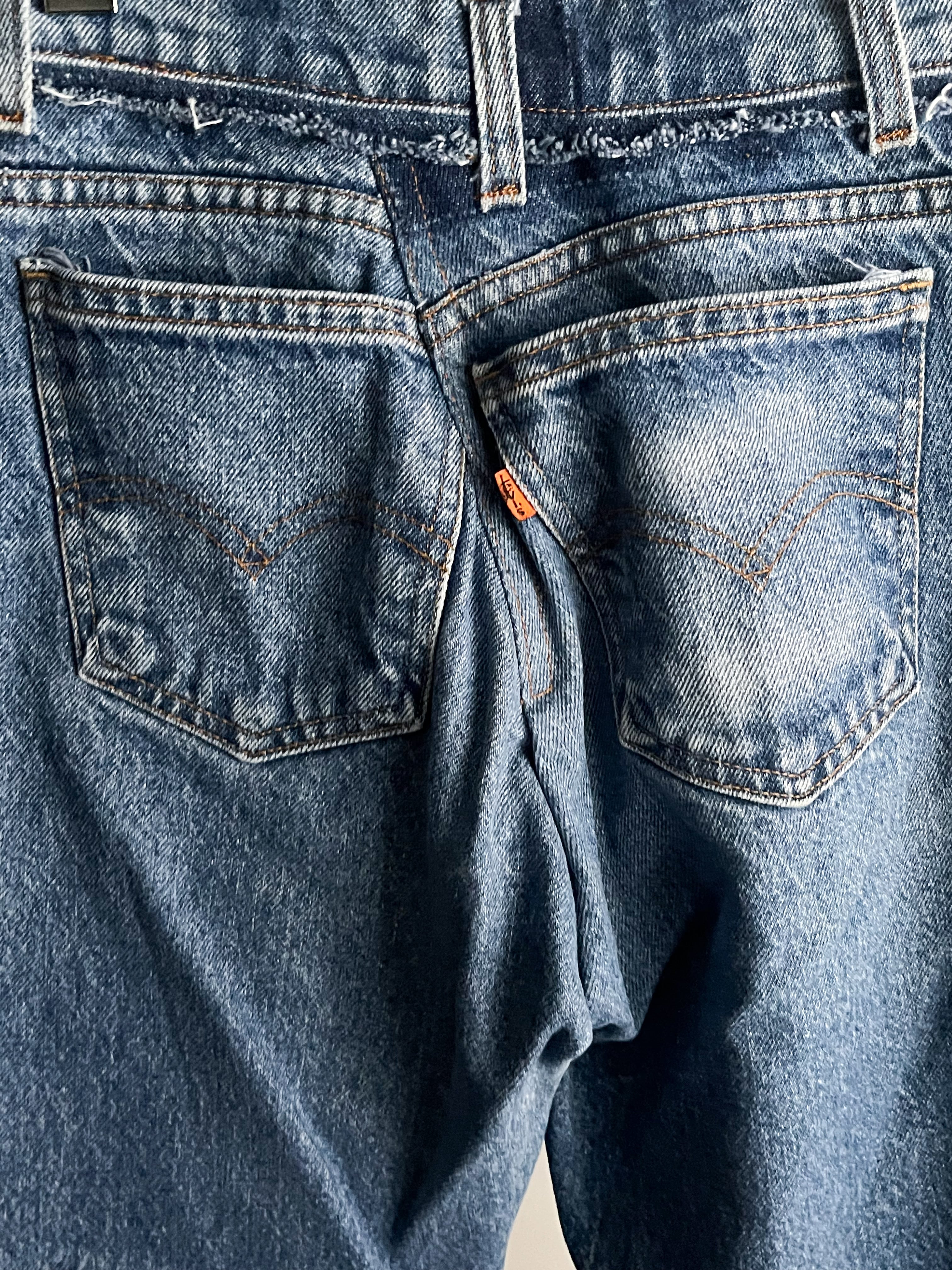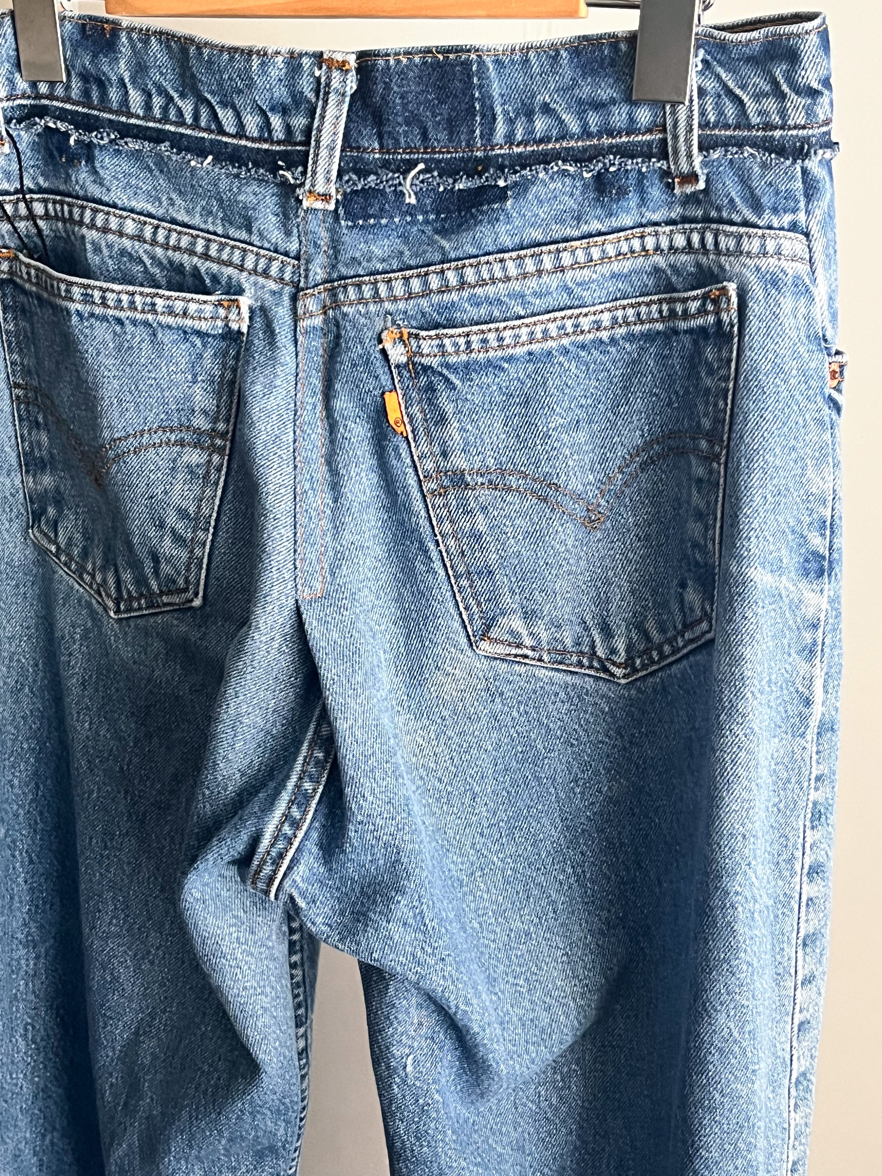 大きなサイズのデニムを後ろのタックで腰回りをスッキリさせたデニム。