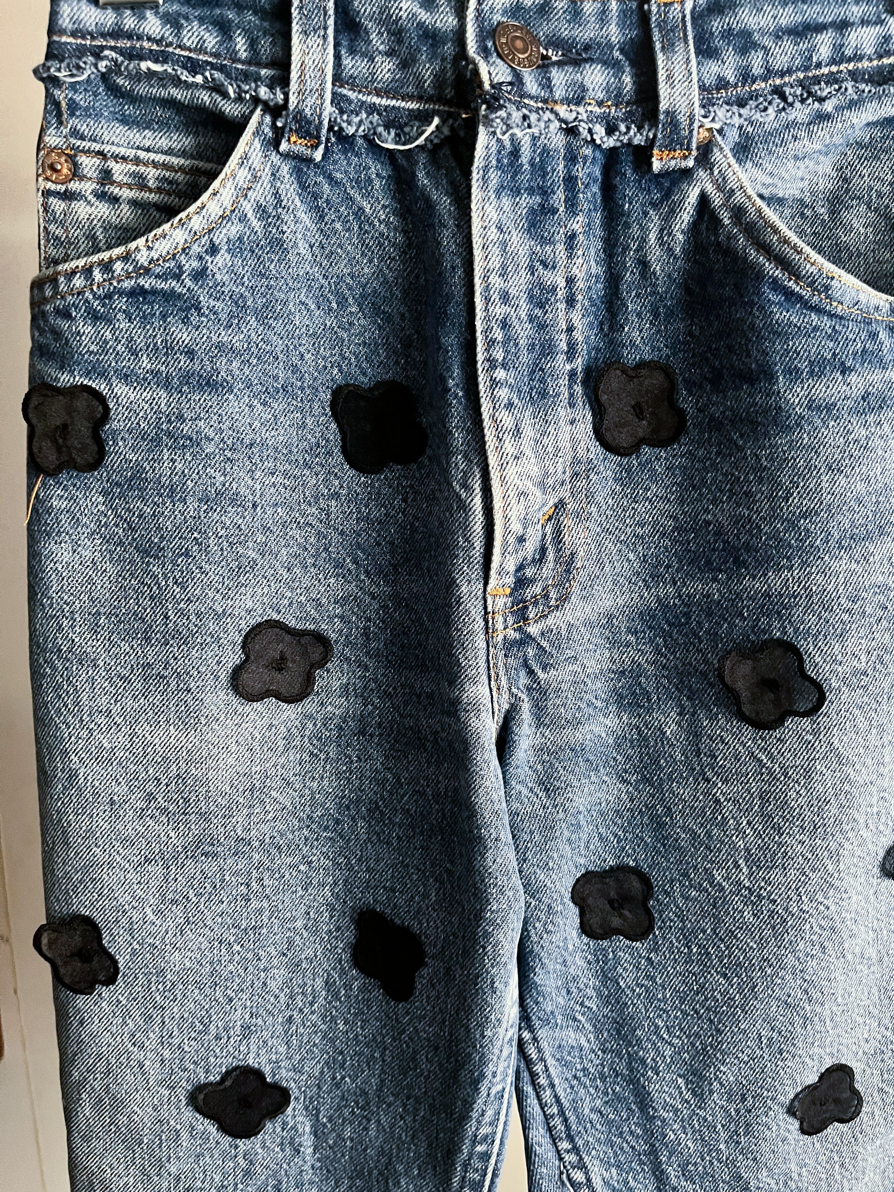フラワーモチーフは一つ一つ手作業で縫い付けてあります。