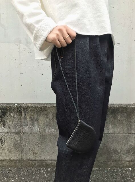 半円をモチーフにしたレザーポーチ。