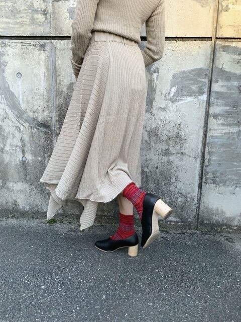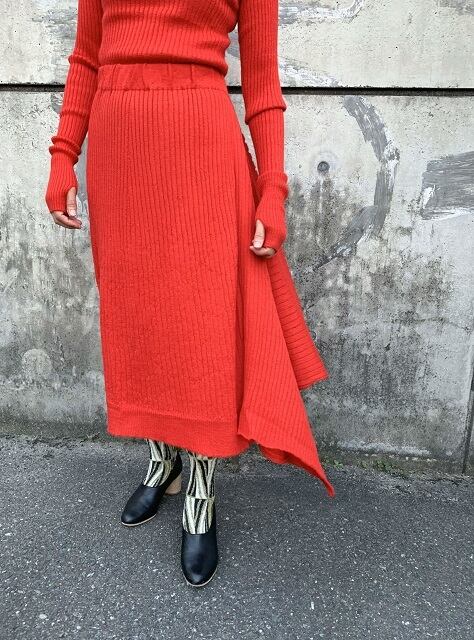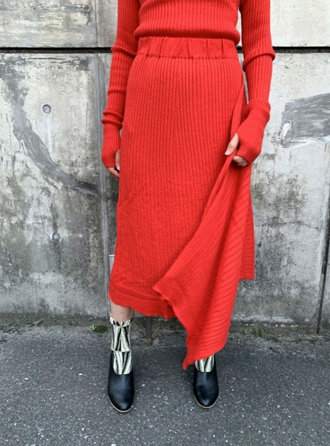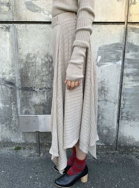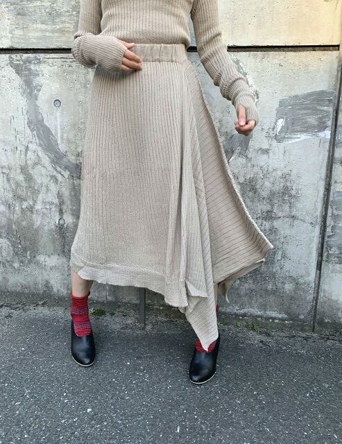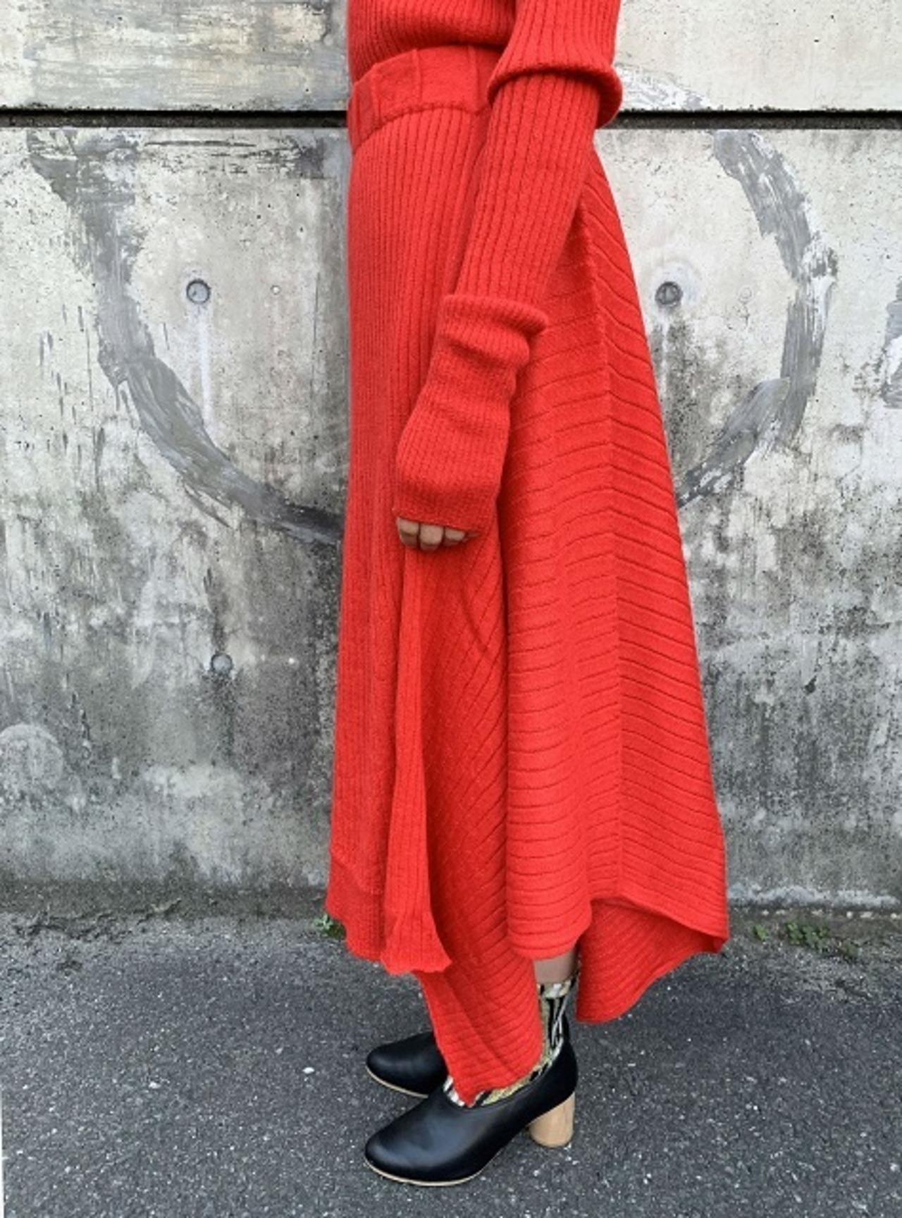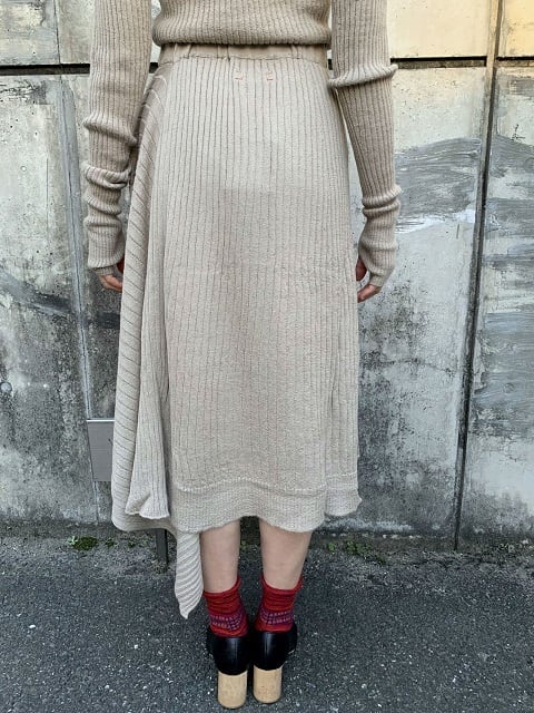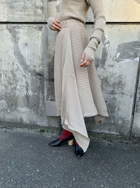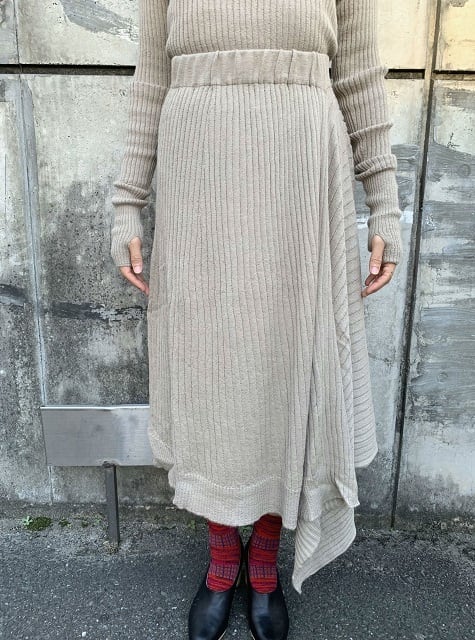 ウエストはゴム仕様。右サイドのドレープが綺麗なアシンメトリーライン。