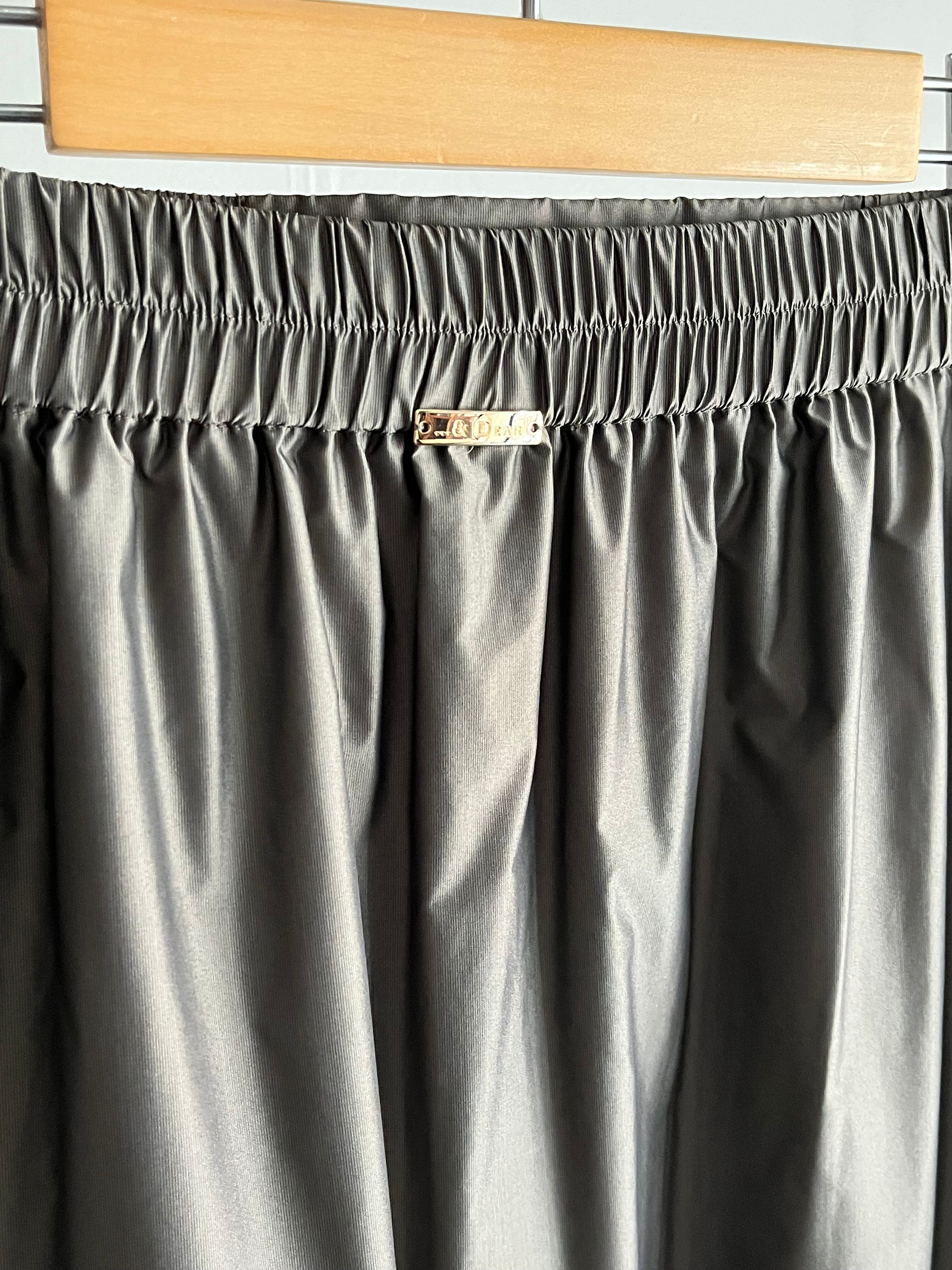 メタリックなカーキ色はどんなトップスのカラーにも合わせ易いです。